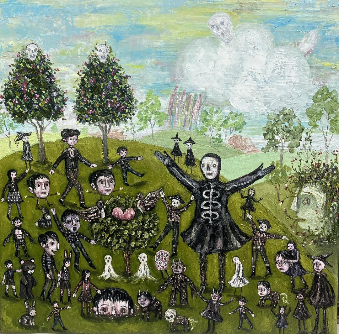 In Tripping Over the Underneath, Daniel Ferlan unveils a dreamlike cast of symbolic figures, masked characters, blooming skulls, and ghostly animals that inhabit landscapes where memory, innocence, and dread collide. These new works do not tell stories; they expose emotional truths, drawing viewers into an internal mythology shaped by love, fear, regret, and wonder. Ferlan’s paintings are not meant to be decoded but felt. Both deeply personal and universally human, this exhibition invites quiet reflection within surreal beauty.