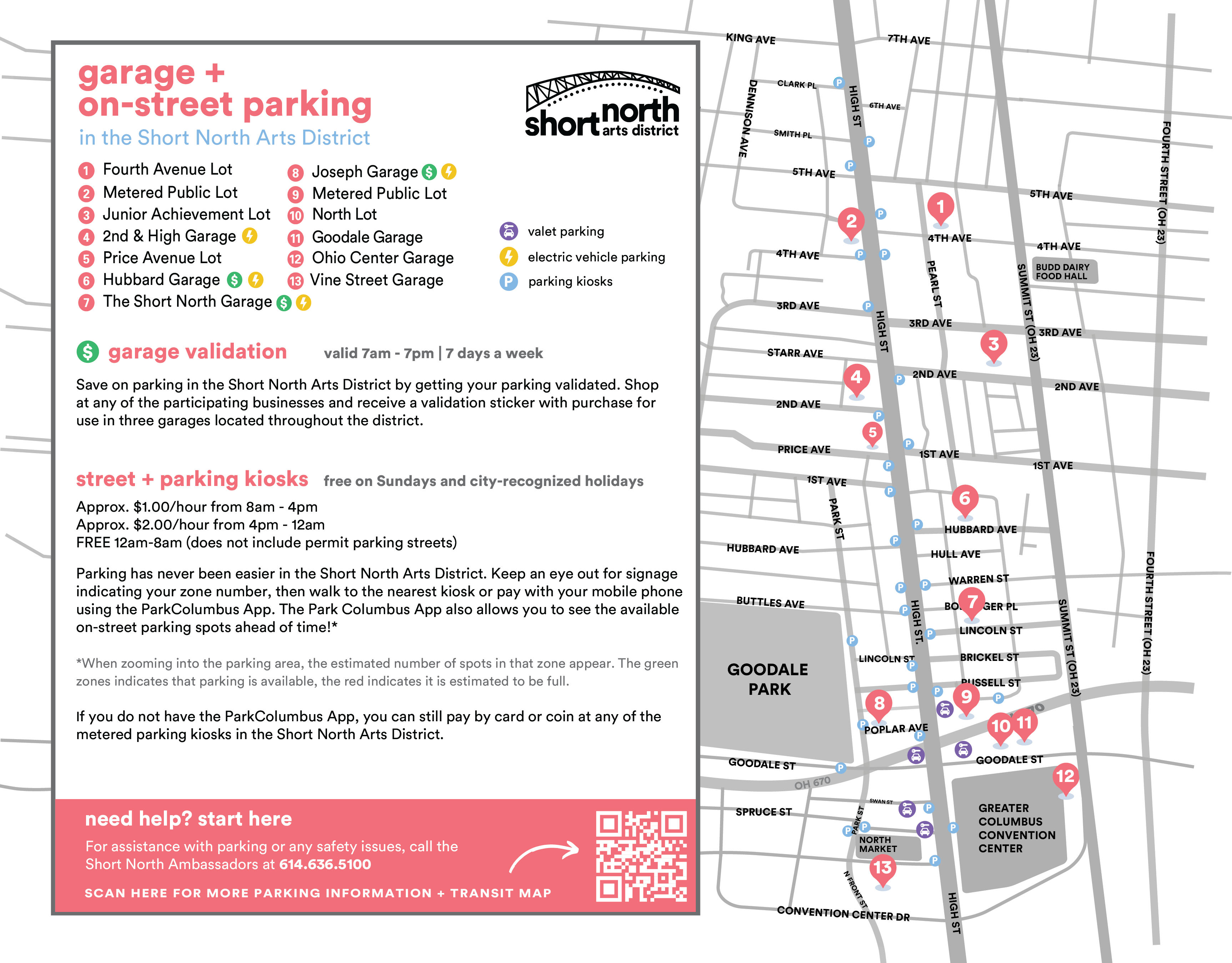 Visitors can park in one of three Short North Arts District garages and enjoy their first two hours free with garage validations. Here’s how:
