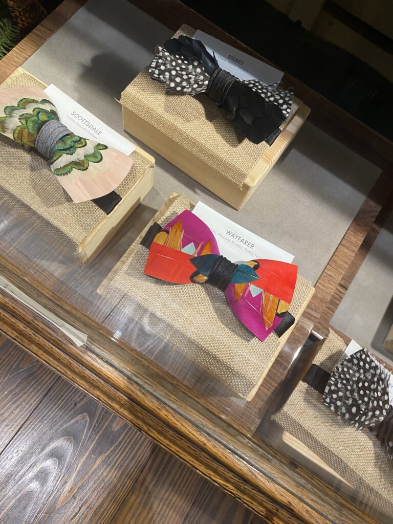 The Wayfarer bow tie is personality-packed featuring layers of goose, pheasant, rooster and turkey feathers that create an asymmetrical, bold and bright pattern.